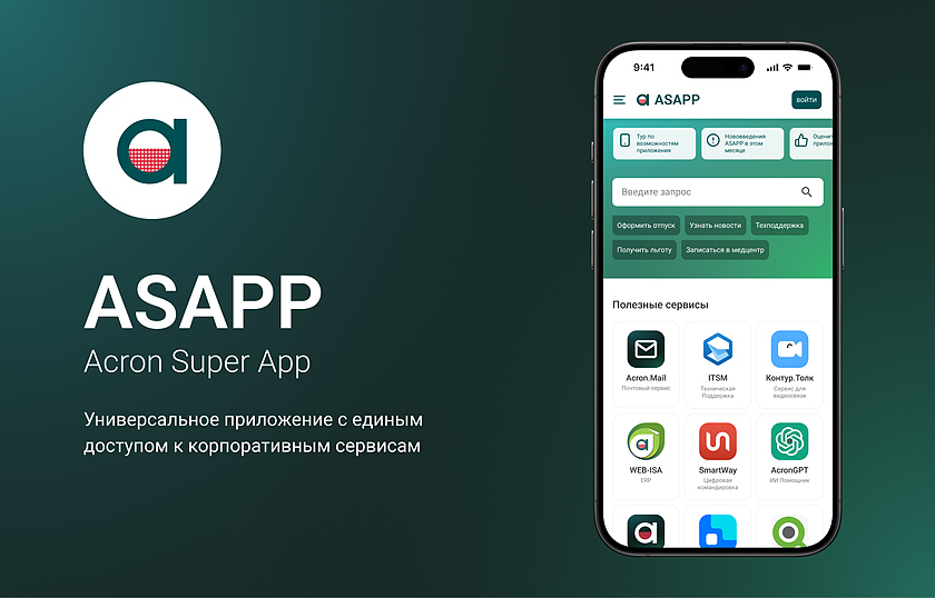 В Acron SuperApp сотрудники могут найти все часто используемые корпоративные сервисы, в том числе такие, как: корпоративная почта, новостной портал компании; cервис «Цифровая командировка», ERP-система ИСА, техническая поддержка ITSM, сервис видеоконференцсвязи, кадровый электронный документооборот и ИИ-помощник.